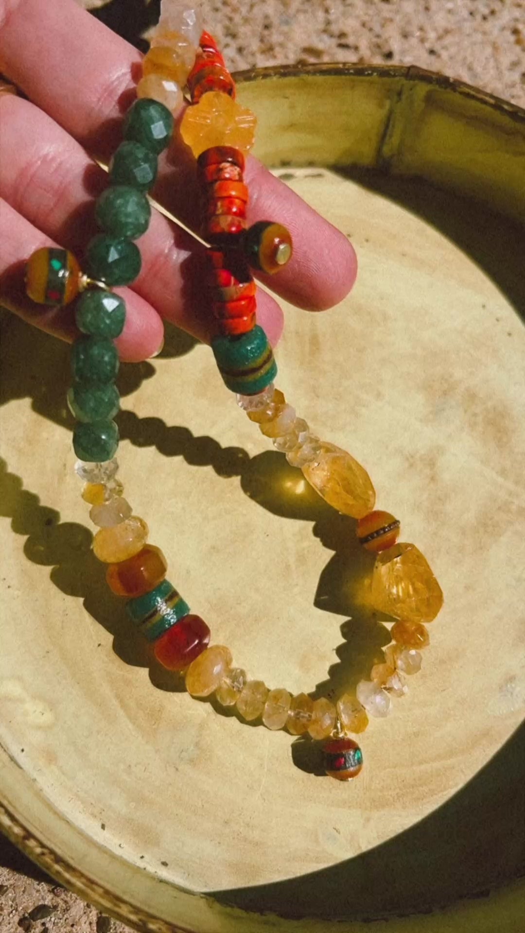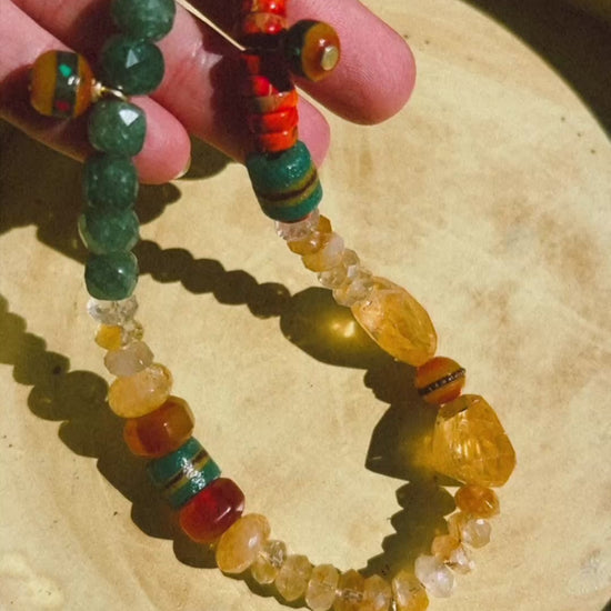 This month we focused on building around raw grade AAA citrine stones! This necklace is truly divine, featuring Nepal beads, variscite sea beads, kente krobo beads, yellow hematoid quartz, carved jade, carnelian, faceted chalcedony and of course more citrine. Instead of doing 2 or even 3 items this month we decided to pour into one insane necklace! A necklace that is unique, a statement yet versatile enough to wear with anything!